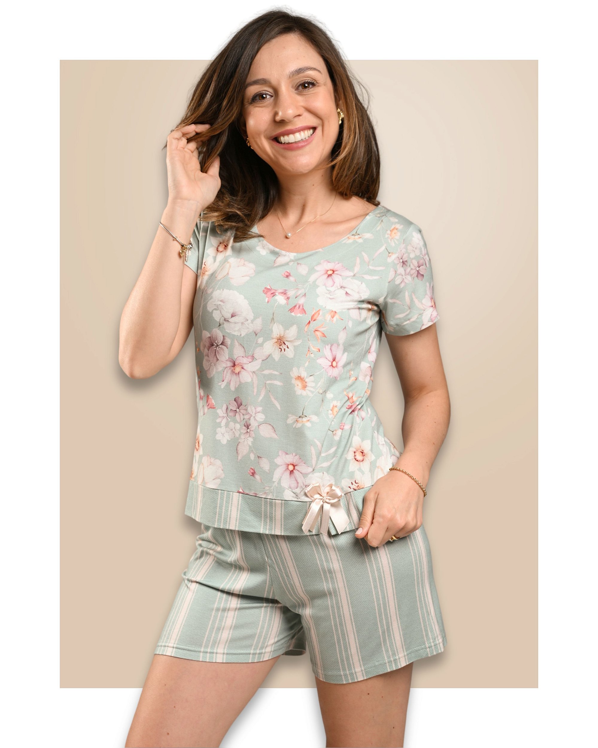 Pijama curto feito em malha leve e fluida, que envolve o corpo com toque suave e confortável.